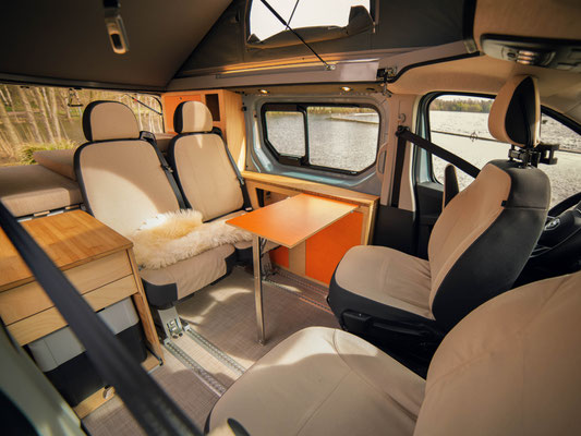Mit unseren Sitzbezügen lässt sich schnell vergessen, dass du in einem Auto sitzt. Sie sind gemütlich und zudem waschbar und schützen so deine Originalsitze für ein langes Camperleben. Unser Boden ist optisch ein Knaller, fühlt sich barfuß richtig gut an und hält gleichzeitig jeder Belastung stand.