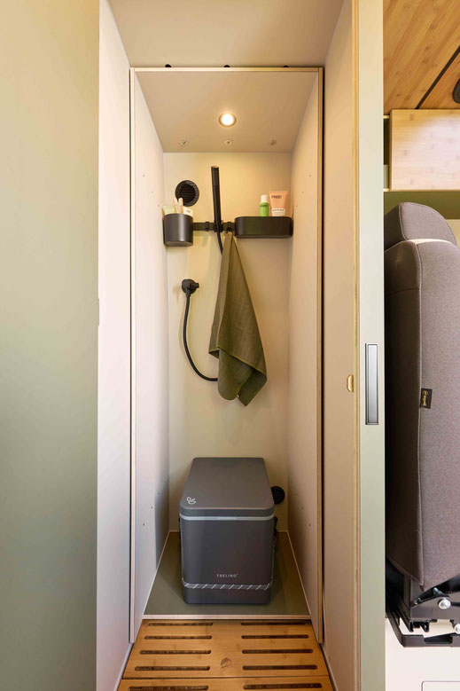 Das besonders großzügige Raumangebot wird durch unsere einzigartige Badezimmerlösung ermöglicht. Wenn du das Badezimmer benötigst, dann ziehst du es wie eine Schublade aus, ansonsten machst du die „Schublade“ wieder zu. Die Trockentrenntoilette steht auf einem erhöhten Sockel und bietet eine optimale Sitzergonomie. Dank der beschichteten Wände und der versiegelten Kanten können wir sogar in der Dusche unserem Design treu bleiben, ohne dass du beim Duschen mit einem klebrigen Duschvorhang kämpfen musst. Einfach Dusche ausfahren und los geht’s. Da das Badezimmer über eine Heizung und eine aktive Abluft verfügt, kannst du dort auch bei geschlossener „Schublade“ deine nasse Kleidung trocknen.