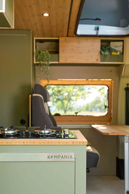 Die Küche ist wie bei Kompanja üblich sehr kompakt und entfaltet sich bei Bedarf zu ihrer wahren Größe. Wenn dir die Arbeitsfläche mal zu klein sein sollte, dann kannst du sie sowohl durch den zweiten Tisch erweitern als auch zusätzlich die Arbeitsfläche unter der Matratze nutzen. Einfach das Bett hochklappen und schon hast du jede Menge Platz. Dein Besteck, Geschirr, deine Kochutensilien, Gewürze und sogar der Weinvorrat passen in die großzügigen und stabilen Schubladen. Wenn dir dieser Platz noch nicht reicht, gibt es noch den erweiterbaren Oberschrank über der Küche. Da der Kühlschrank mit Eisfach von beiden Seiten geöffnet werden kann, erreichst du deine kühlen Getränke, ohne deinen Camper betreten zu müssen und kannst deine Einkäufe direkt aus dem Einkaufswagen einladen. Der Küchenarmatur ist ein 3-Wege-Wasserhahn für warmes, kaltes und gefiltertes Trinkwasser. Damit kannst du das Wasser aus deinen Tanks immer bedenkenlos trinken. Die Abdeckung des Edelstahlwaschbeckens dient auch als Schneidebrett und besteht wie das Küchentop als lebensmittelecht geöltem Bambus. Zum Kochen stehen dir immer mindestens zwei Flammen zur Verfügung – ob auf Induktion, Gas oder einer Kombination aus beidem liegt ganz bei dir. Und weil wir alle am liebsten draußen sind, kannst du dein Kochfeld auch auf deinem ebenfalls in die Küche integrierten Außentisch verwenden.