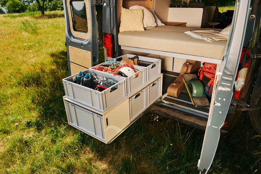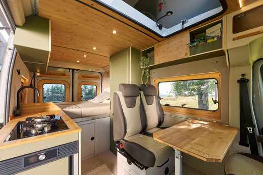 Die Sitzgruppe im Kompanja ZWEI besteht aus den gedrehten Vordersitzen und der Sitzbank. Bei der Sitzbank lässt sich die Breite und die Sitzneigung verstellen. So kannst du es dir auf der Sitzbank auch zu zweit richtig gemütlich machen. Sämtliche Sitzbankstellungen sind auch während der Fahrt zulässig. Zwei breite Kindersitze können nebeneinander an den serienmäßigen Isofix Halterungen befestigt werden. 2 große Tische bieten ausreichend Raum zum Kartenspielen, Malen, Essen und auch Arbeiten. Dank der klugen Position des zweiten Tisches bleibt der Mittelgang offen, so dass du dich im Fahrzeug frei bewegen kannst, ohne umbauen zu müssen. Der große Schrank über der Sitzgruppe bietet dir gut zugänglichen Stauraum und auch die variable Ablage über den Vordersitzen fasst eine ganze Menge an kleinen und großen Dingen. Zwei USB und USBC-Dosen sind direkt am Tisch platziert und sowohl das Ambiente- als auch das Hauptlicht lassen sich unabhängig voneinander dimmen.